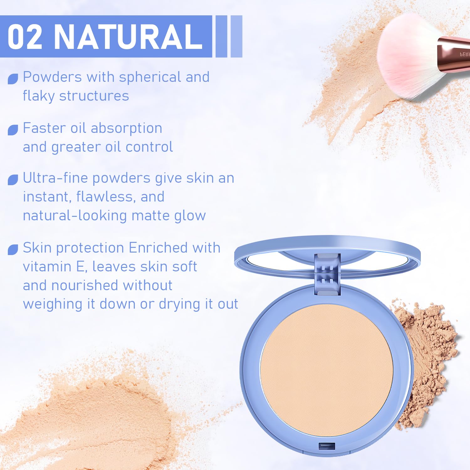 - Portability: Unlike loose powders, our pressed powders are perfect for touch-ups on the go. Includes built-in mirror. The compact design fits easily in any purse or makeup bag, making it ideal for travel or quick fixes throughout the day