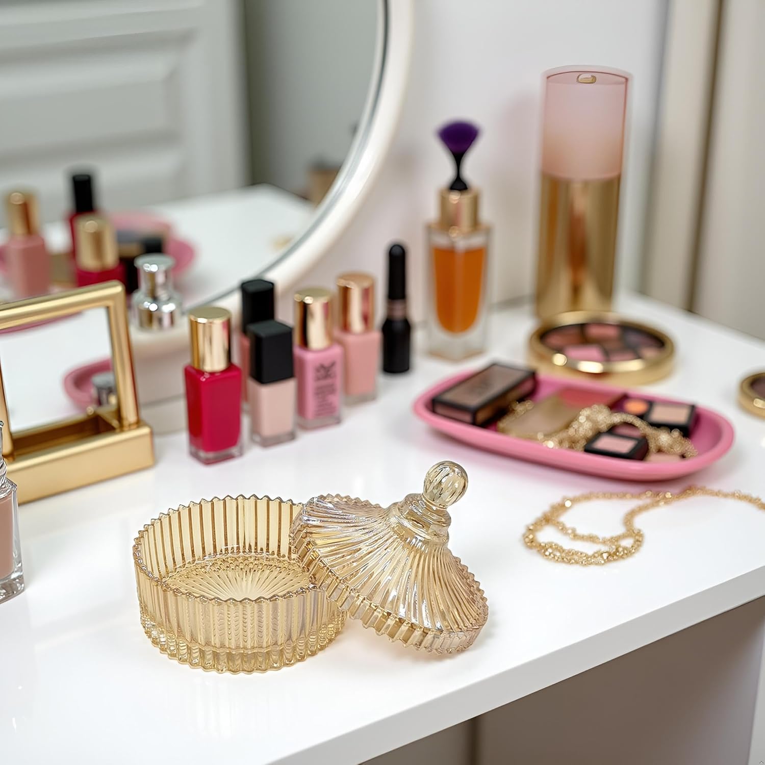 - 【Multi-Purpose Glass Heart Box】This glass powder puff container can not only be used to organize your powder puffs, but also can be used to store earrings, rings, bracelets, hair accessories, trinkets and other items on your vanity, bathroom and bedroom. It can keep your items away from dust and water, and play a protective and decorative role to meet the needs of female users for cosmetic organization