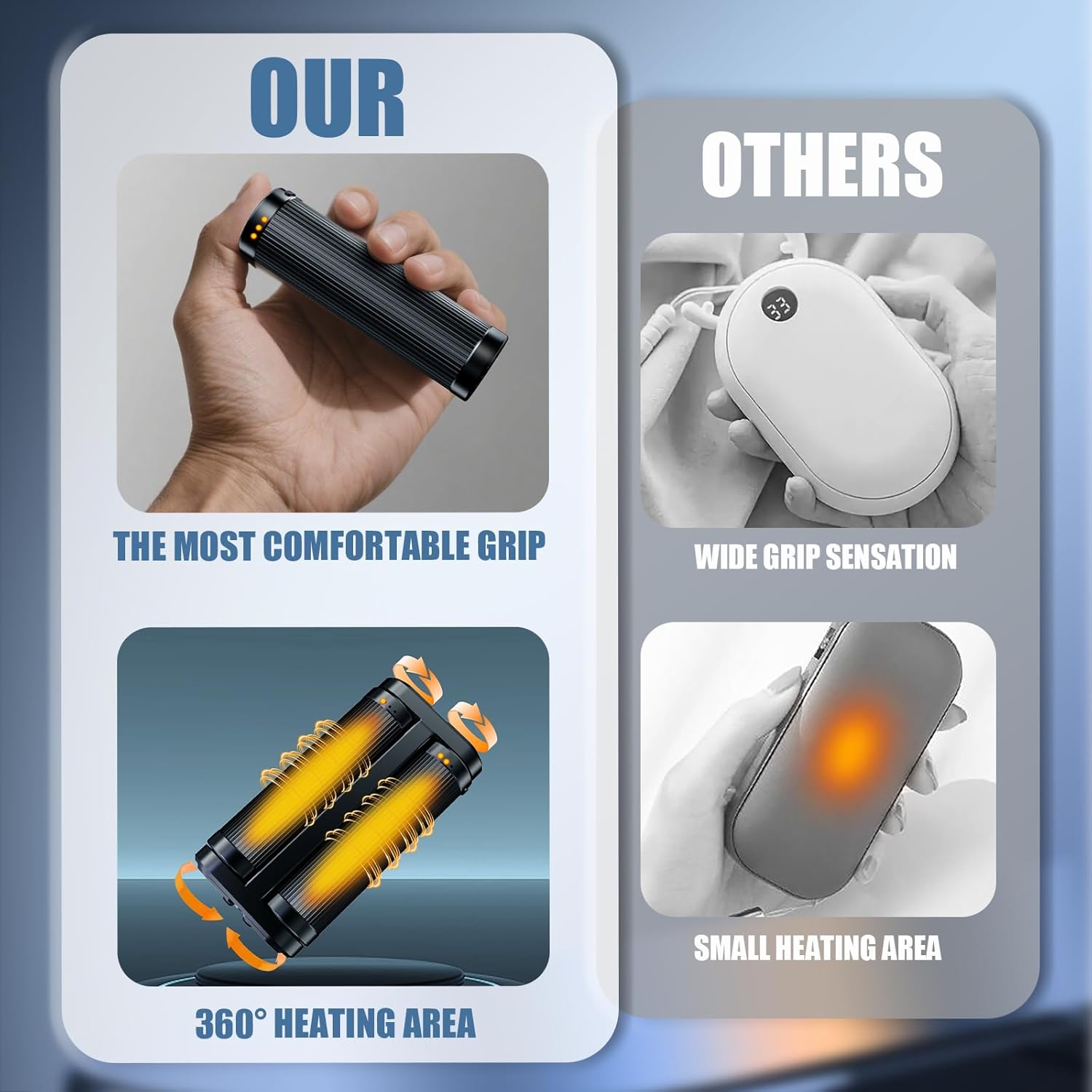 - 【Portable Pocket Hand Warmer】Overall dimensions: 1.9'‘W*3.9’'L*0.9''H. Weighing only 5.4 ounces, it is extremely portable—you’ll barely notice its weight and can easily slip it into your pocket. This set includes two symmetrical hand warmers that can be combined into a palm-sized warmer, providing 360-degree warmth for your hands. Additionally, you can use them separately or share them with family and friends.