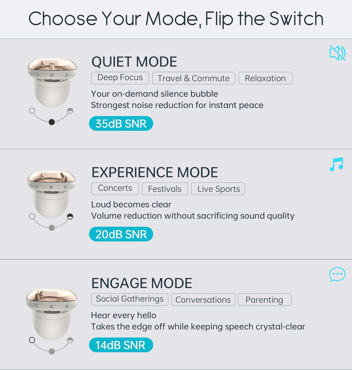 - 【3-MODE NOISE CONTROL】:Ear plugs for sleeping change between 35dB (Quite mode),20dB (Experience mode) and 14dB (Engage mode),three modes with a twistable dial, tailoring your audio experience to any environment.Seamlessly transition between three optimized modes: Travel & Rest for deep quite, Office & Focus for clear communication, and Live Experience for enhanced ambient sound immersion