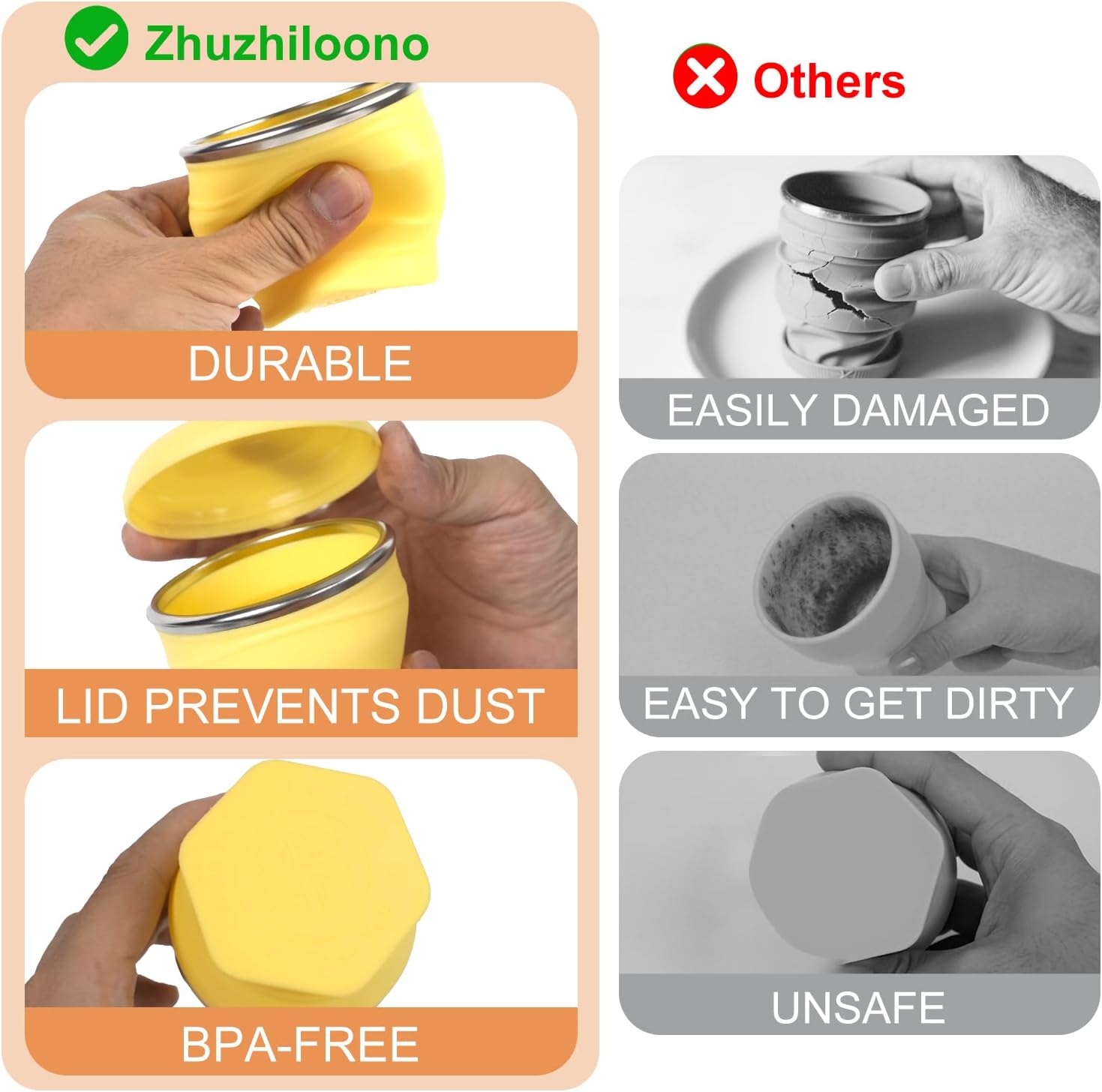 - 【Durable & Food-Grade Silicone】 The collapsible travel cup made from 100% premium, BPA-free silicone that is odor-resistant, tasteless, and flexible. It won't crack, break, or retain odors like plastic or metal alternatives.