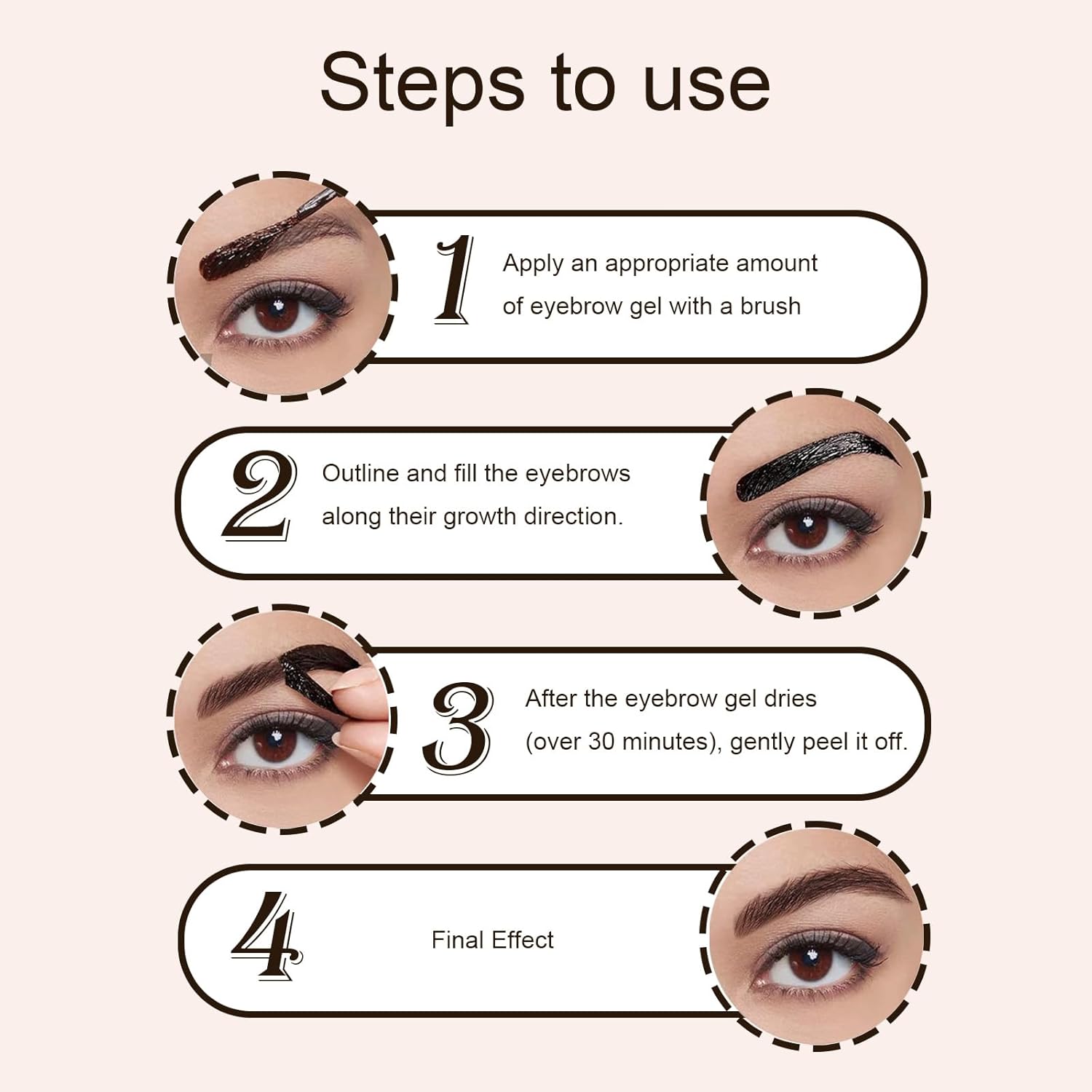 - Easy to Use: Simply apply the gel gently to your brows using the brush, then wait for 30 minutes or more before gently peeling it off to achieve fuller brows. After peeling, avoid water contact immediately to allow the color to set and maintain its waterproof properties.